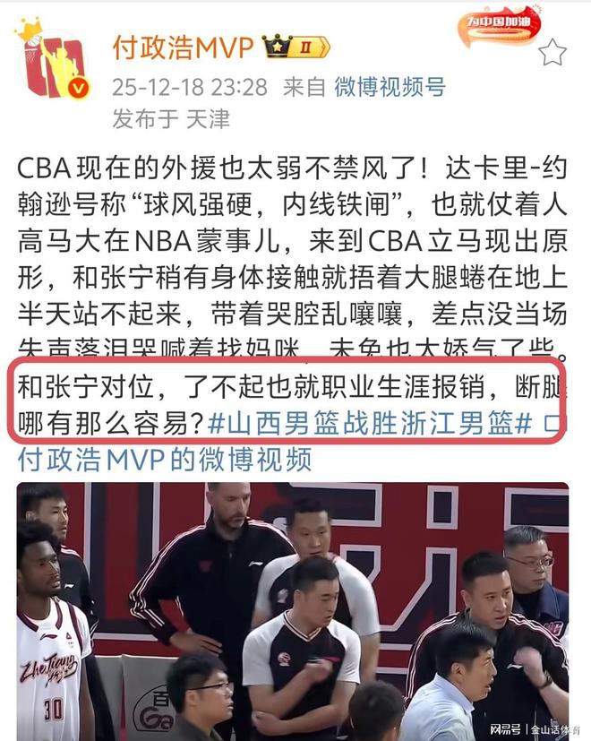 赛后,针对张宁的这次犯规,著名媒体人付政浩更新个人社媒,正话反说疑似“暗讽”张宁。原文为“CBA现在的外援也太弱不禁风了!达卡里-约翰逊号称“球风强硬,内线铁闸”,也就仗着人高马大在NBA蒙事儿,来到CBA立马现出原形,和张宁稍有身体接触就捂着大腿蜷在地上半天站不起来,带着哭腔乱嚷嚷,差点没当场失声落泪哭喊着找妈咪,未免也太娇气了些。和张宁对位,了不起也就职业生涯报销,断腿哪有那么容易?”。